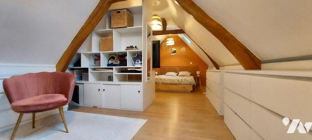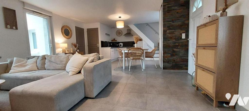 La maison dispose également d’une salle d’eau avec WC et branchement pour machine à laver, ainsi qu’à l’étage d’une chambre confortable et d’un bureau, idéal pour le télétravail ou accueillir vos invités.